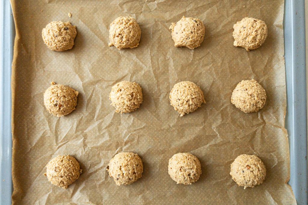 9. Aus dem Teig Kugeln von ca 40 g formen und auf das Backblech setzen. 12 Cookies je Blech gehen sich gut aus.