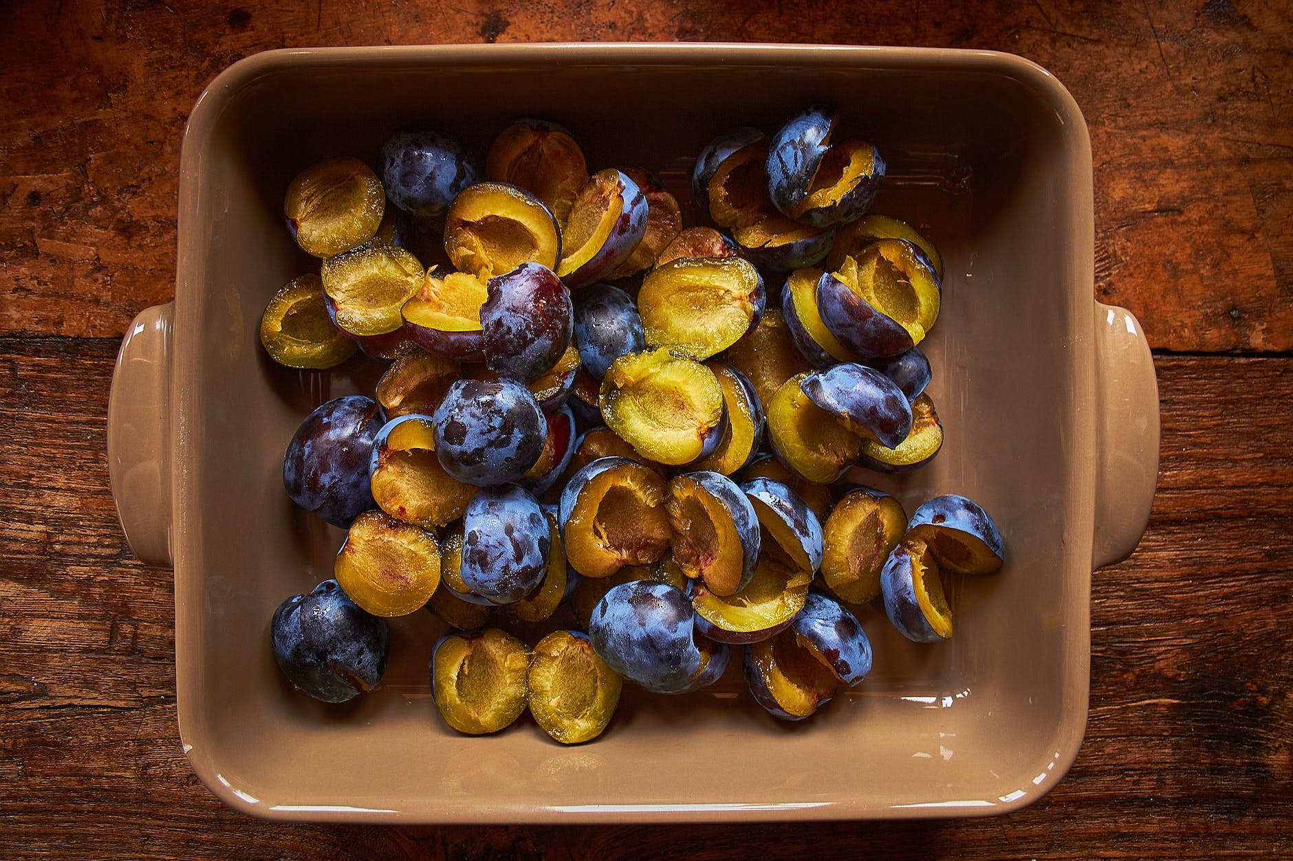 - Die Zwetschken mit einem scharfen Messer in kleine Stücke schneiden.