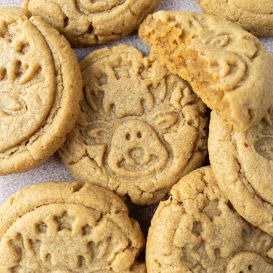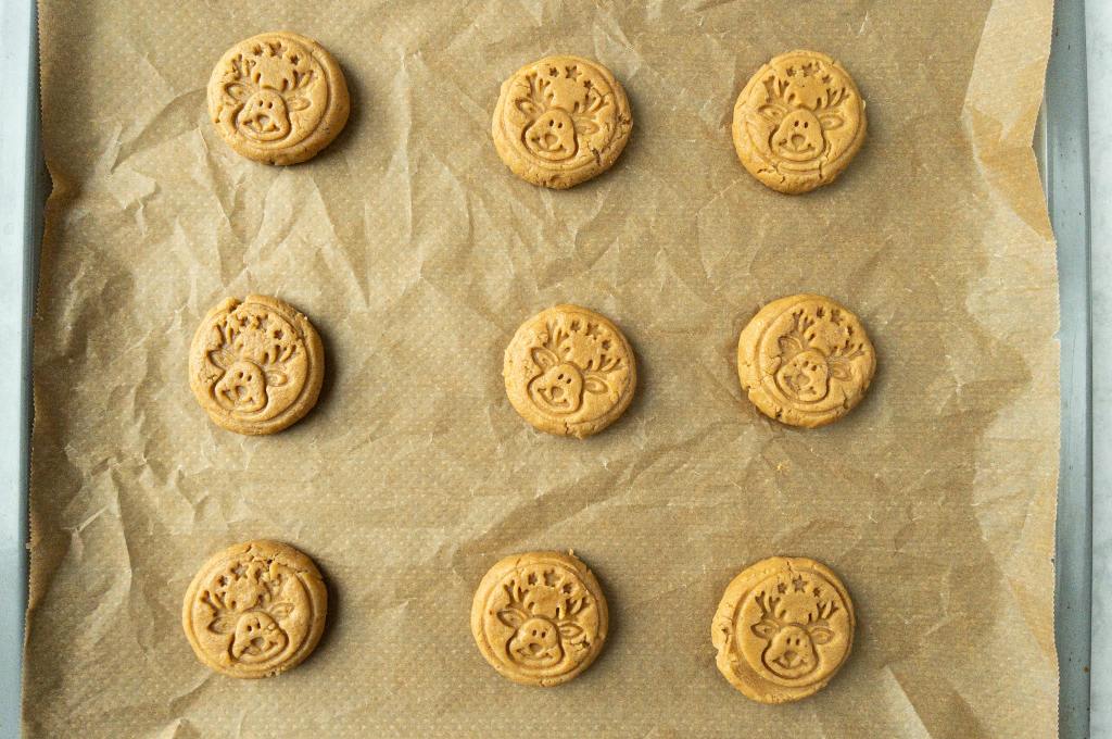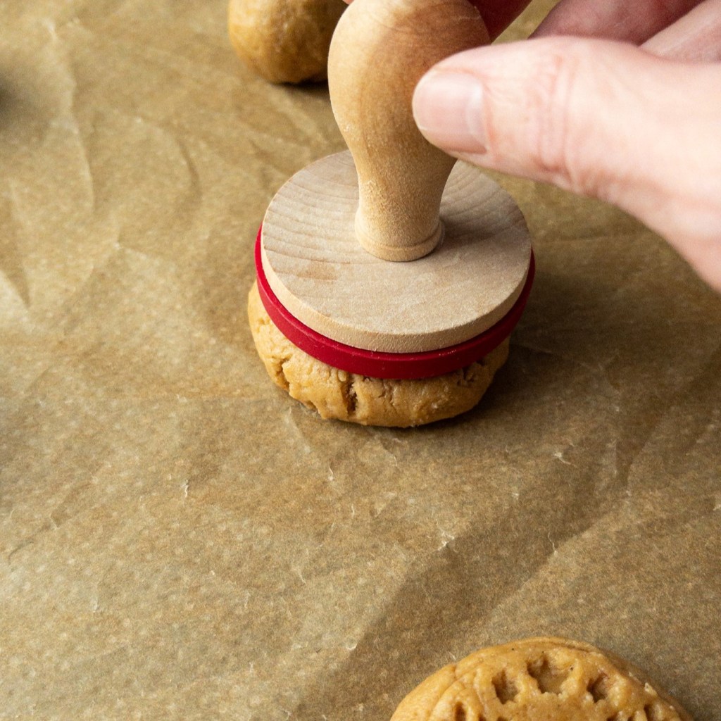 - Jeden Cookie mit Stempel bedrucken. Dabei den Stempel nur sanft reindrücken, damit die Erdnussbutter Cookies nicht zu flach werden.
