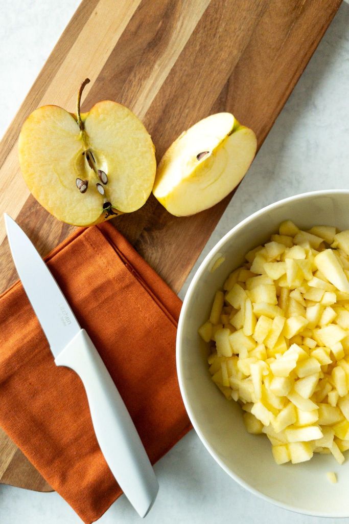 - Die Äpfel mit einem scharfen Messer schälen und in kleine Stücke schneiden.