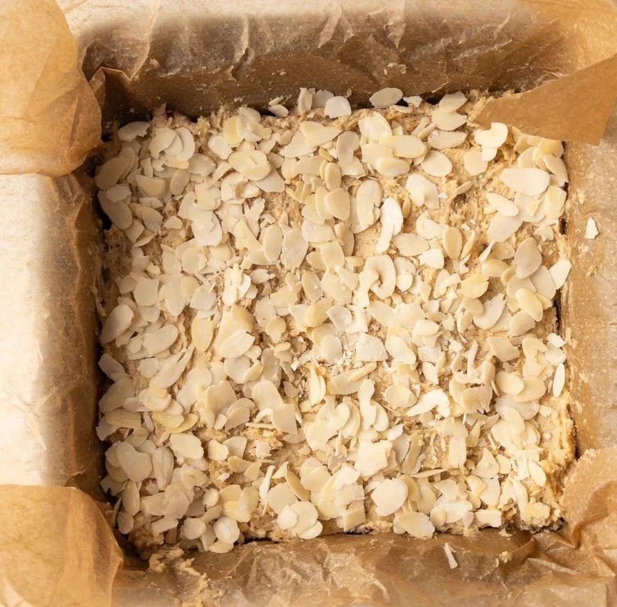 - Die gehobelten Mandeln werden dicht, aber gerecht über die Blondies gestreut.