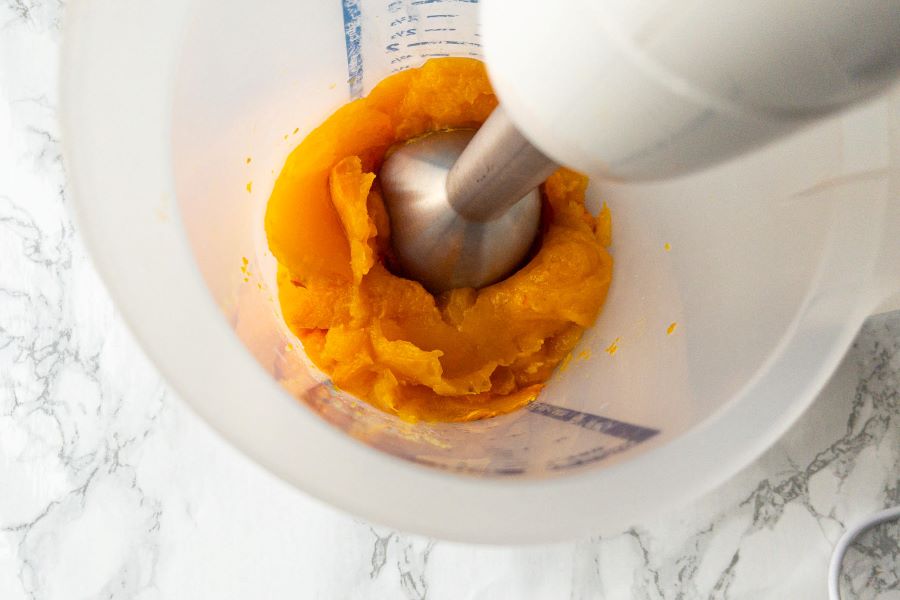 - Die gebackenen Kürbisspalten (ohne Schale) mit einem Stabmixer pürieren.