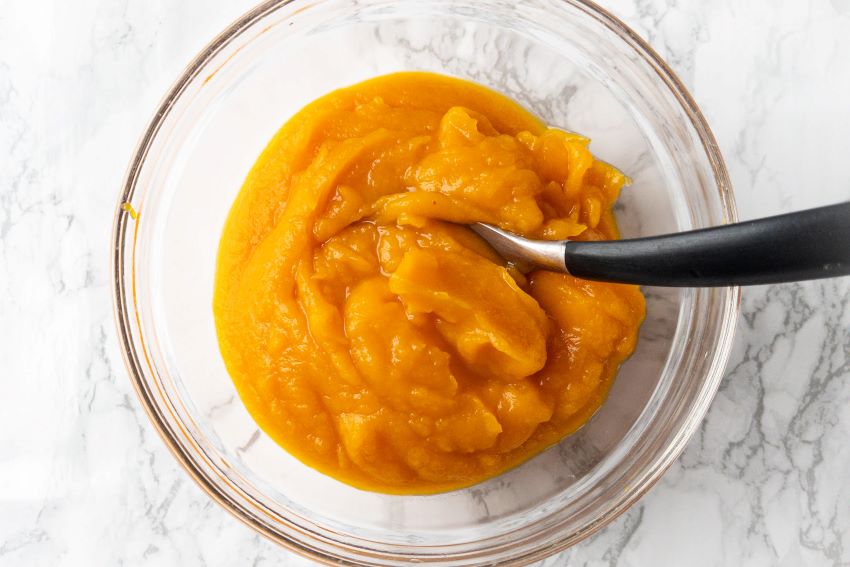Kürbispüree: Für das Kürbispüree verwende ich in der Regel Hokkaido-Kürbis, den ich im Backofen backe. Im Vergleich zum Kochen verliert der Kürbis während des Backens etwas mehr Flüssigkeit, was genau richtig für unsere gewünschte Konsistenz des Pürees ist.