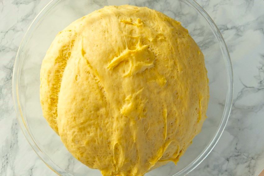 - Den Kürbis-Hefeteig nun in einer sauberen Schüssel, abgedeckt mit einem Geschirrtuch, für 1 bis 2 Stunden rasten lassen.
