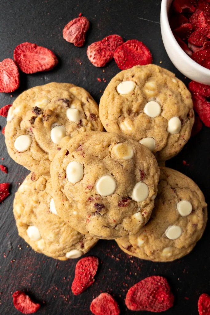 Wenn’s nach mir geht, müssten immer ein paar von diesen Erdbeer-Cookies mit weißer Schokolade auf Vorrat da sein – süß, weich und genau das Richtige für den kleinen Cookie-Hunger.
