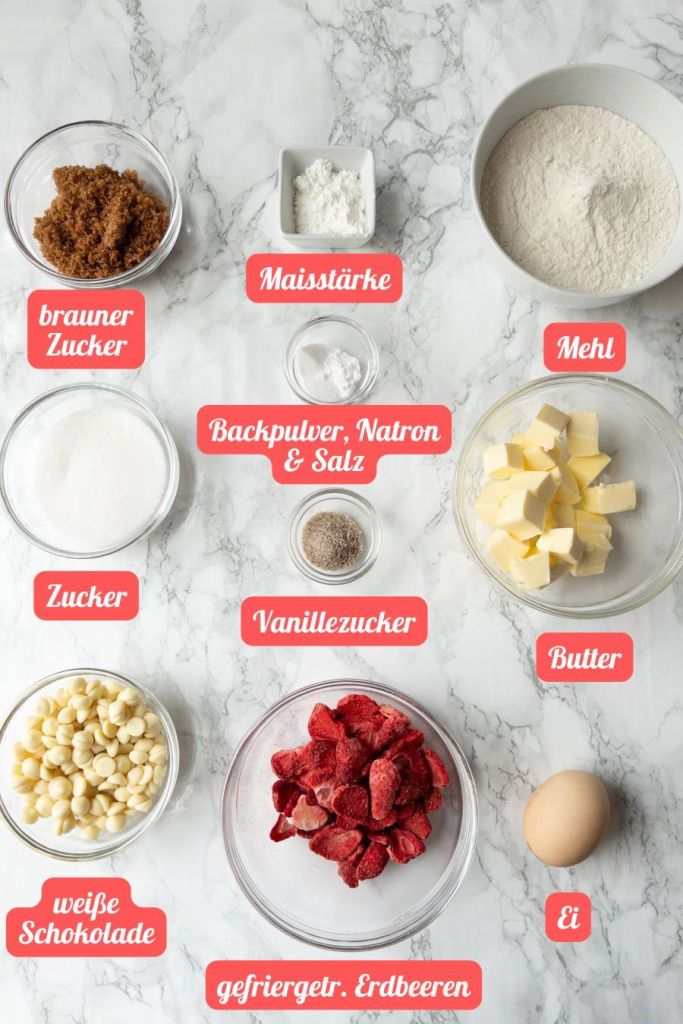 - Welche Zutaten benötigen wir für diese chewy Erdbeer Cookies mit weißer Schokolade?
